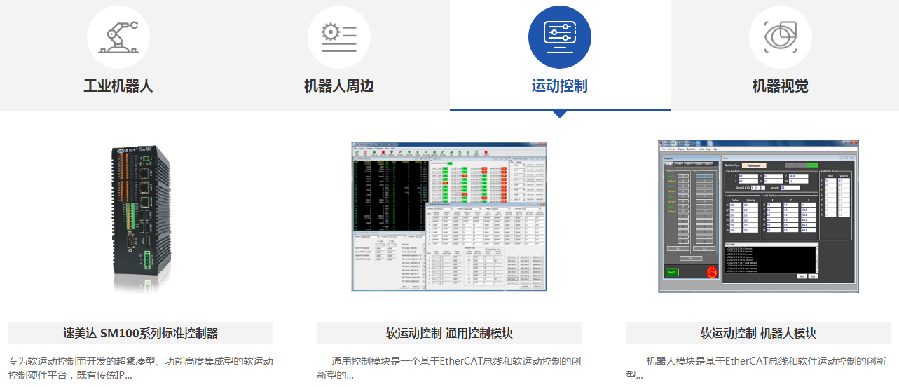 全新網(wǎng)站將速美達各系列產(chǎn)品線進行全方位展示,將工業(yè)機器人、機器人周邊產(chǎn)品、運動控制產(chǎn)品、機器視覺產(chǎn)品、工業(yè)互聯(lián)網(wǎng)產(chǎn)品進行詳盡的介紹。同時,推出多樣化的機器視覺定位、檢測系統(tǒng),還有全新的EtherCAT網(wǎng)絡運動控制平臺,為您的高效生產(chǎn)提供更可靠的方法。