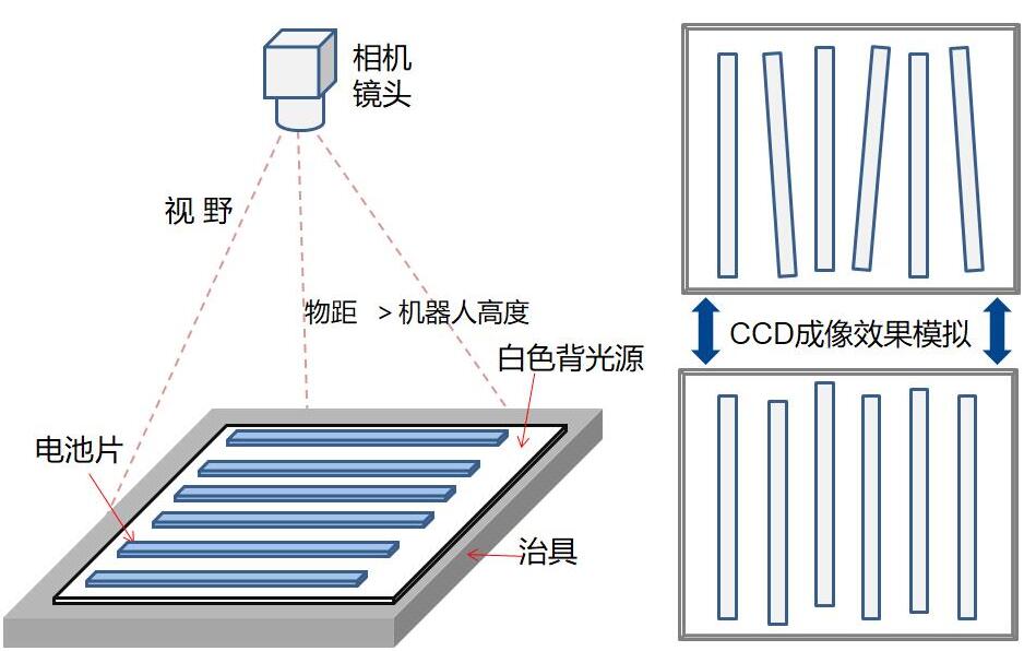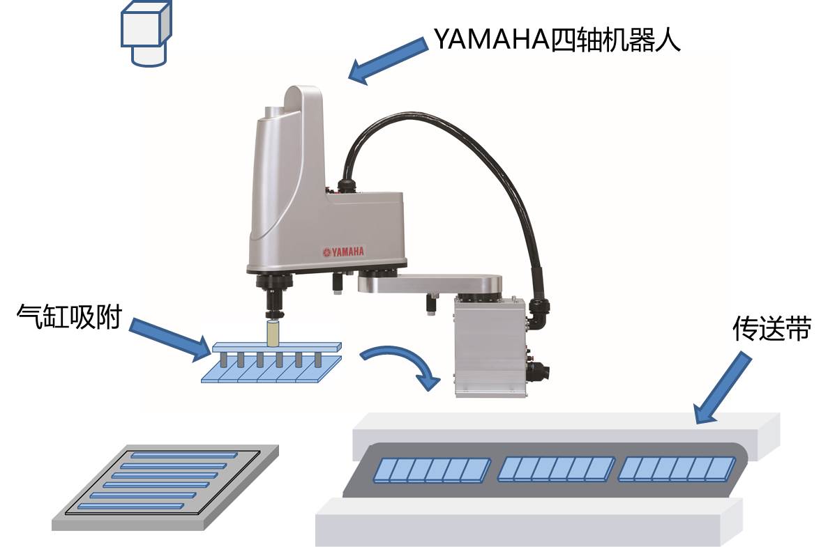 速美達(dá)疊瓦組件系統(tǒng)方案,選用YAMAHA四軸機(jī)器人搭配機(jī)器視覺(jué)進(jìn)行結(jié)合,首先由速美達(dá)的視覺(jué)系統(tǒng)對(duì)裝有電池片的托盤(pán)進(jìn)行視覺(jué)定位,期間視覺(jué)系統(tǒng)會(huì)經(jīng)過(guò)數(shù)據(jù)處理對(duì)最終成像效果進(jìn)行模擬。再由四軸機(jī)器人對(duì)視覺(jué)定位后的電池片進(jìn)行氣缸抓取,以疊瓦的方式排列好擺放在傳送帶上,疊瓦后的電池片經(jīng)過(guò)傳送帶通過(guò)固化機(jī)完成一整套流程。