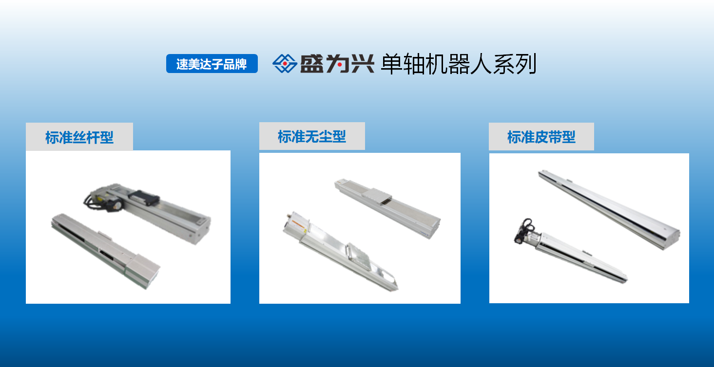 速美達(dá)子品牌盛為興自主研發(fā)生產(chǎn)的單軸機(jī)器人系列,多種型號的單軸機(jī)器人可以覆蓋各個生產(chǎn)領(lǐng)域,可安裝外置/內(nèi)置光電傳感,外觀陽極氧化處理,使用高速靜音化滾珠絲桿。