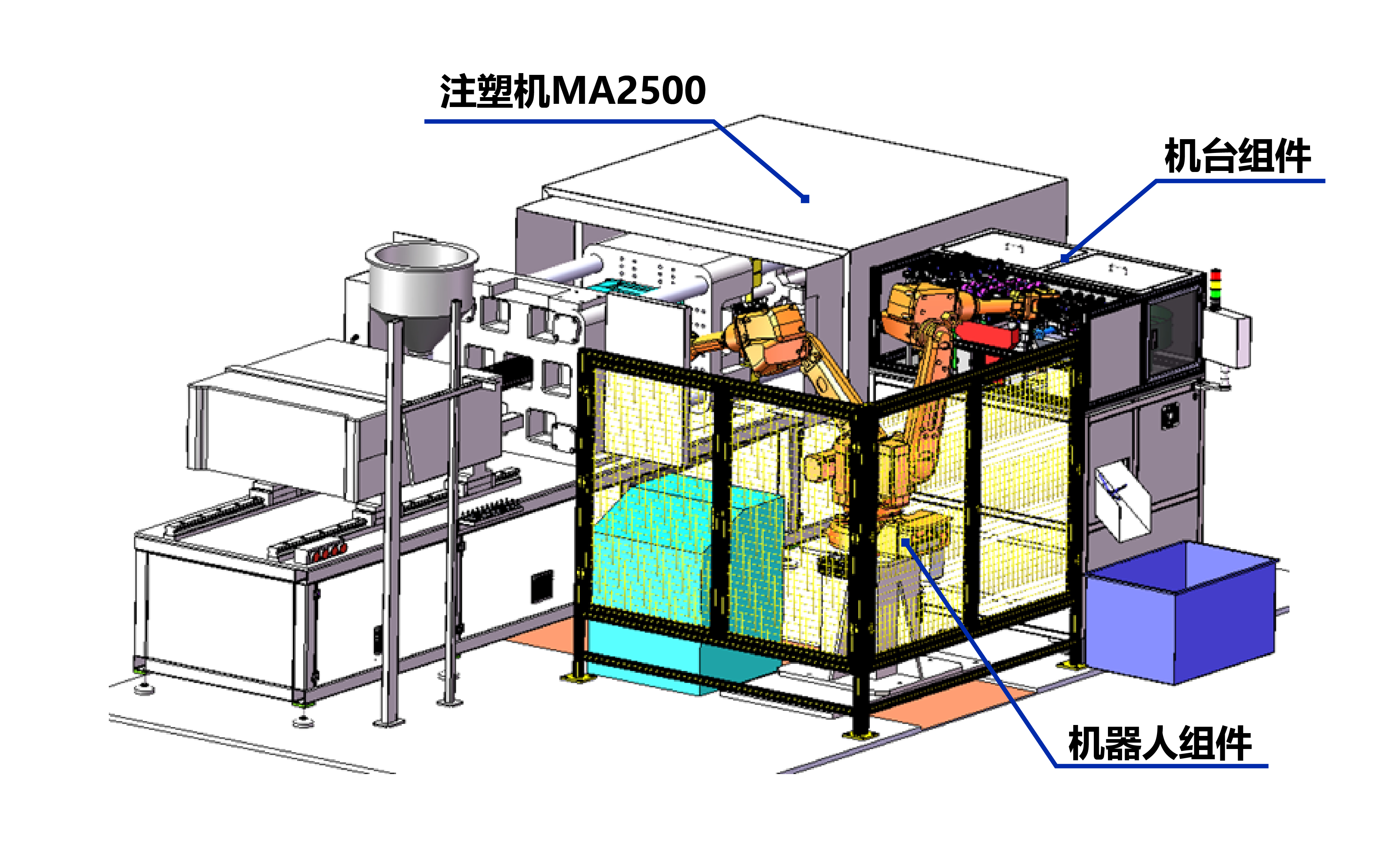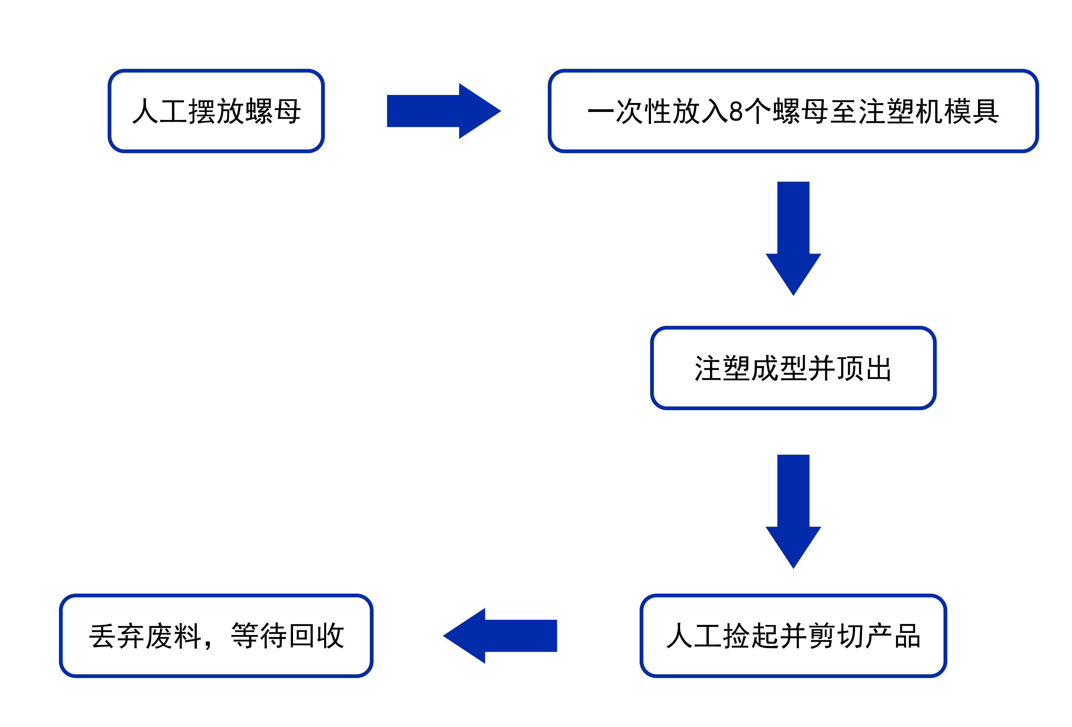 該案例是針對(duì)車間注塑工序的提效案例,在案例的注塑工序中,需要人工完成產(chǎn)品擺放、上料、拾料、減料、丟棄廢料總共五道工序,全程需要有人跟進(jìn)機(jī)器,如想在效率上得到提升,需要投入大量的人力資源,該方案可以利用自動(dòng)化設(shè)備與注塑機(jī)自動(dòng)聯(lián)機(jī)生產(chǎn),減少勞動(dòng)力,大幅提升效率。