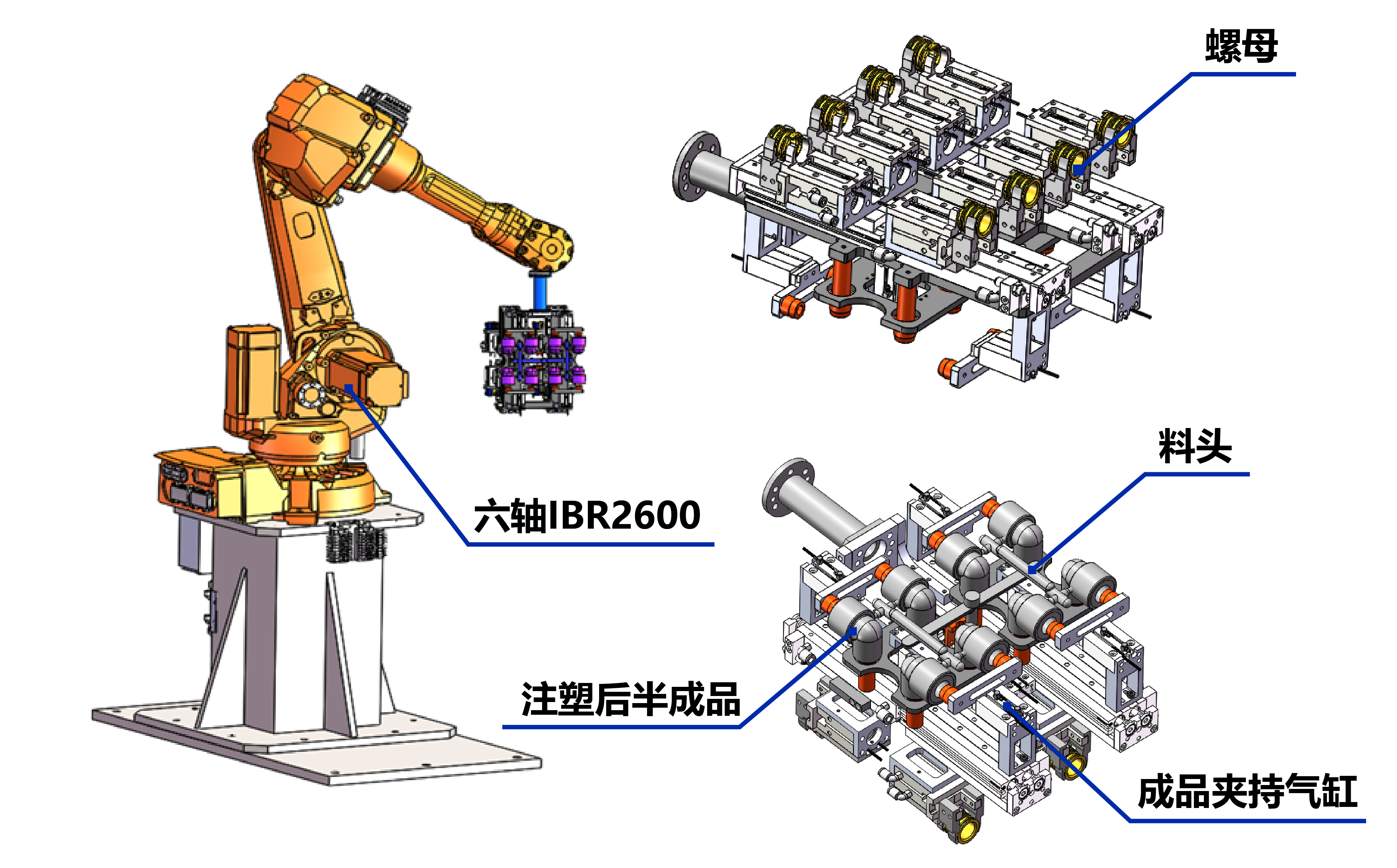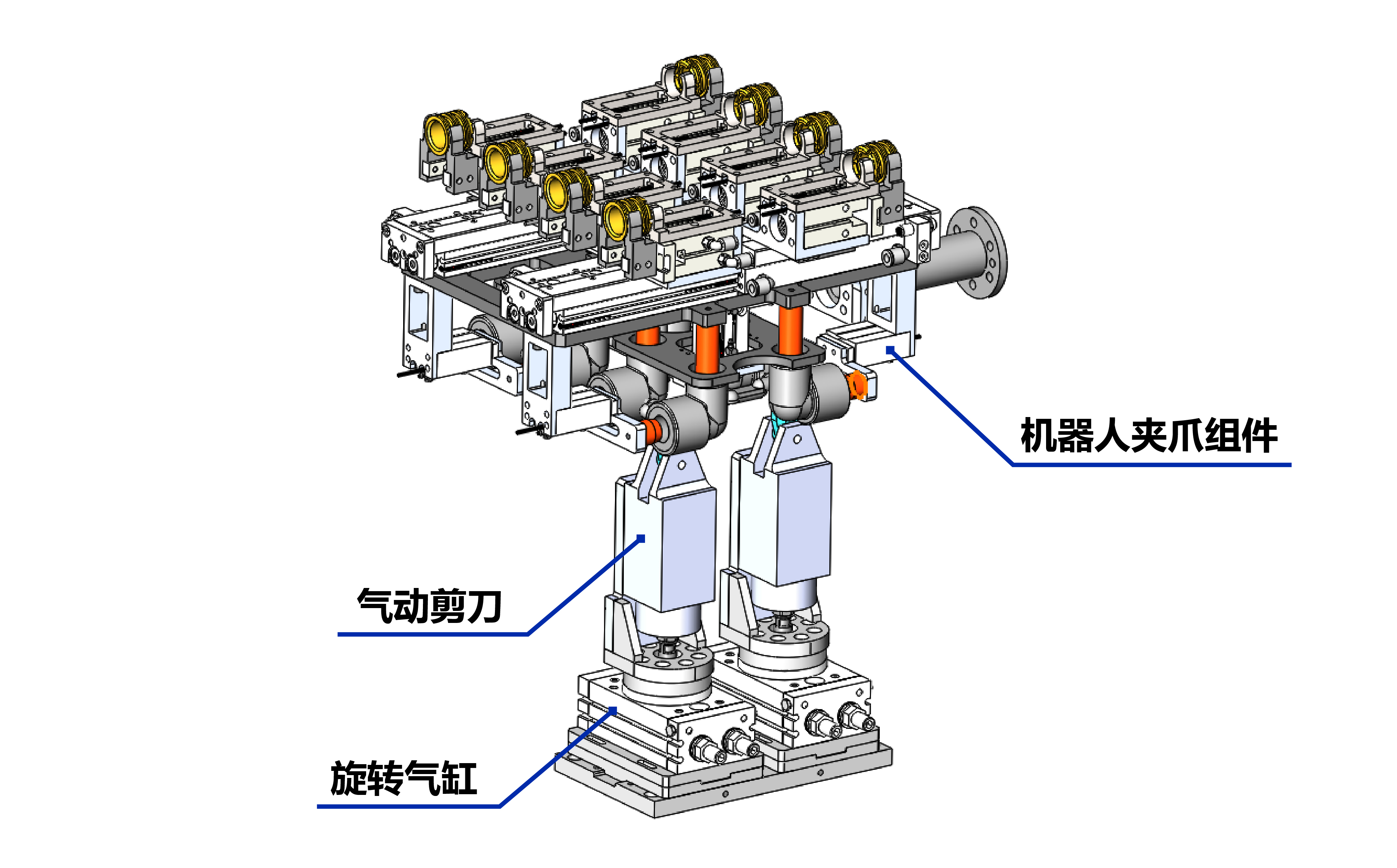 機(jī)器人從注塑機(jī)下料移至剪刀位置,兩個(gè)氣動(dòng)剪刀每次剪兩個(gè)產(chǎn)品,剪兩次,再旋轉(zhuǎn)180°剪另一側(cè)產(chǎn)品。